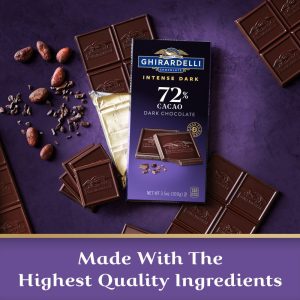 Treat yourself or someone special to the ultimate indulgence with GHIRARDELLI Intense Dark 72% Cacao Dark Chocolate Bars. Each intensely delicious square caters to the senses with its rich chocolate intensity. Enjoy after dinner, break into small squares for easy portioning, or give as a gift. GHIRARDELLI Intense Dark Chocolate Bar is made with high-quality cocoa beans and ingredients, skillfully blended to deliver intensely delicious results with subtle flavors of mocha, ripe blackberry, and succulent cherry.