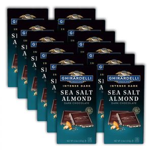 Enjoy a decadent experience with GHIRARDELLI Intense Dark Sea Salt Almond Dark Chocolate Bars. This case of 12 dark chocolate bars is crafted with high-quality cocoa beans and skillfully blended with roasted almonds and sea salt for an irresistible combination of salty and sweet. Each intensely delicious square caters to your senses and perfect for after dinner treat!